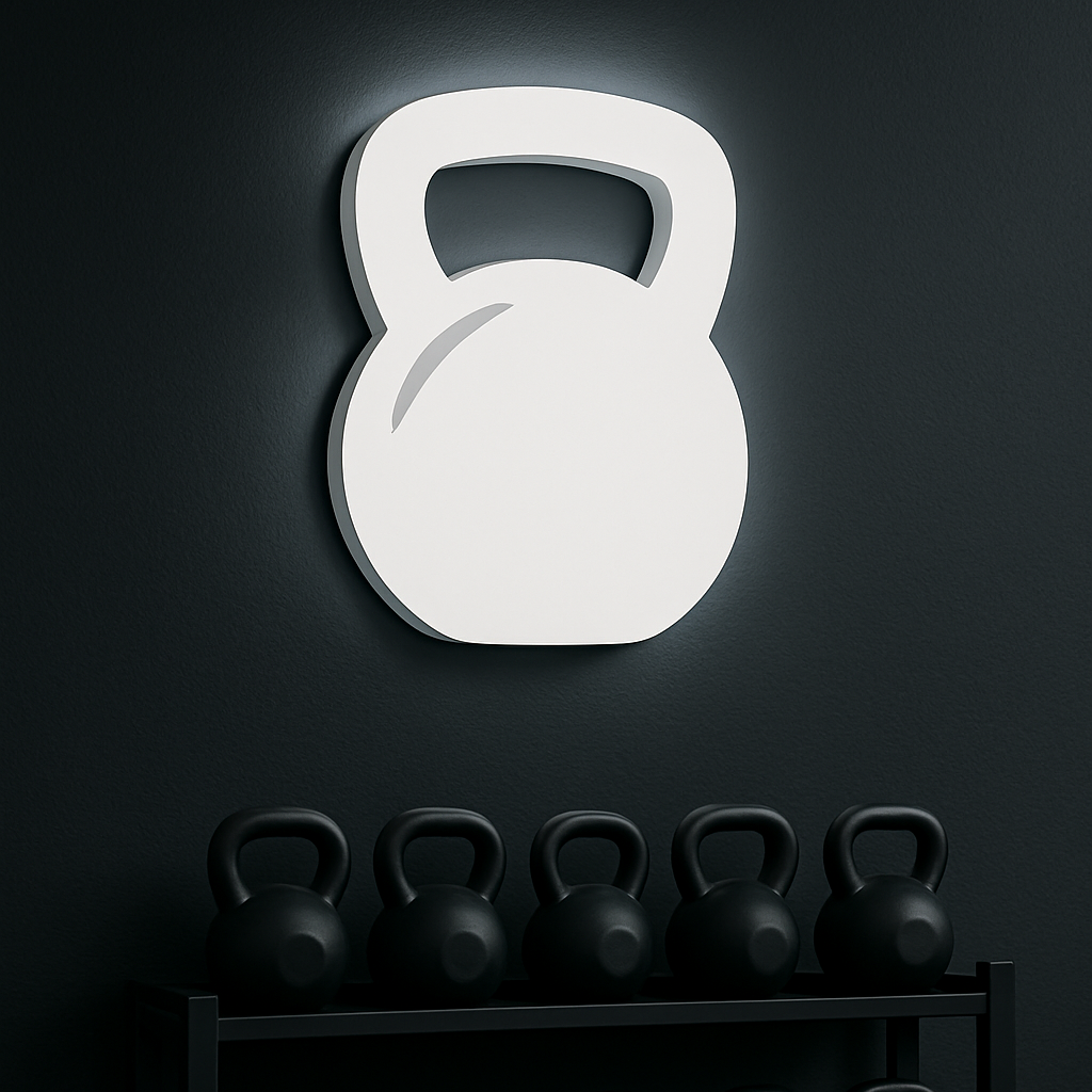 Upgrade your gym aesthetic with this premium black metal kettlebell sign featuring a soft LED backlit glow. Perfect for home gyms, PT studios, CrossFit spaces and boutique wellness centres.