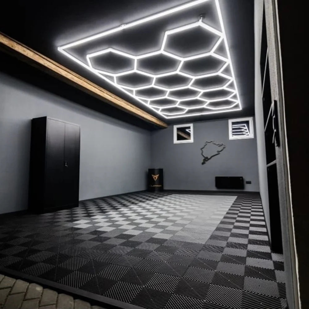 Depending on your usage, 14 grid hexagon lights are a fantastic choice for showing off your car collection, illuminating a gym or displaying them in your office. Our hexagonal lights feature a 14 grid layout with a supporting frame which offers a stunning design, the overall size is 4845mm x 2435mm. Whilst being larger in size, they feature 6500k cool white lighting. Our hexagonal lights provide a consistent bright light whilst working on tasks such as working out, detailing cars or brightening up a display room.