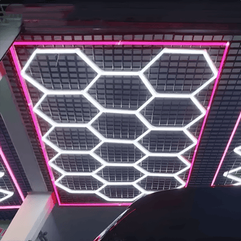 Make a bold statement in large garages, gyms and commercial spaces with our 14-Grid Hexagon Pink Lights With Frame. This impressive full-frame design (4845mm x 2435mm) combines ultra-bright 6500K cool-white central lighting with a vibrant pink LED border, giving your space a modern, eye-catching aesthetic.