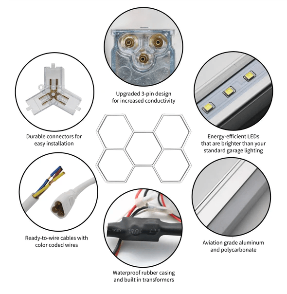 Our 3 grid hexagonal lights are a great lighting choice and are popular in the automotive industry. With its 3-Grid layout our hexagonal lights are perfect for smaller garages, businesses and gyms. They provide a modern look whilst still offering the practicality and functionality of bright lightning.