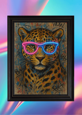 This striking wall piece fuses urban graffiti textures with a wild jungle spirit. The leopard’s intense stare is framed by oversized neon glasses that glow in vibrant blue and pink, giving a modern LED-style pop to classic street art.