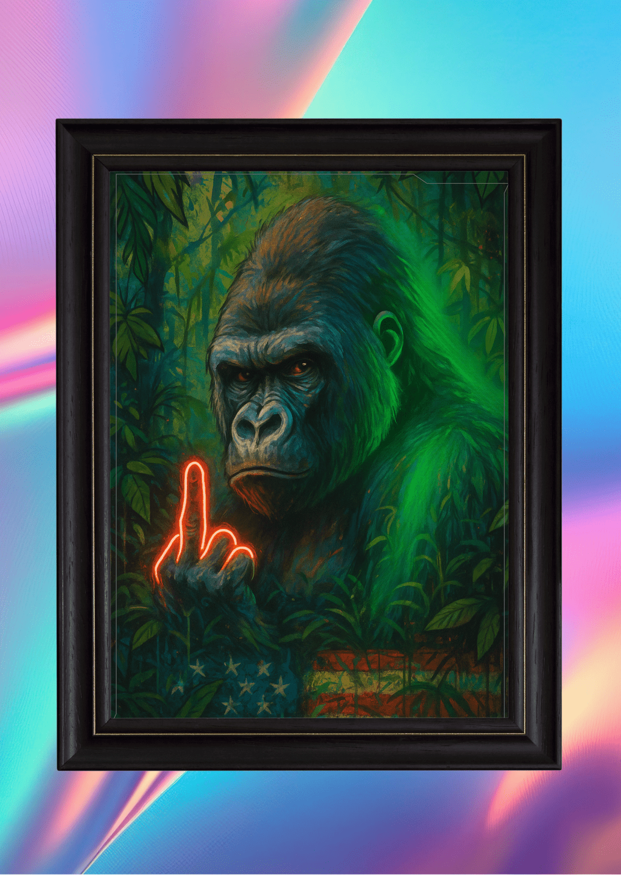Set in a lush jungle backdrop, this gorilla doesn’t just break the rules – it mocks them. Subtle American flag elements add cultural commentary, making this piece as thought-provoking as it is eye-catching.