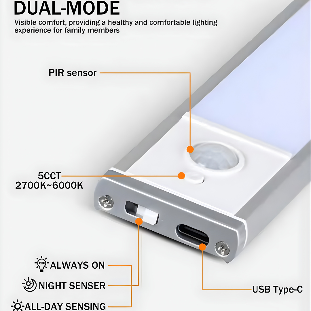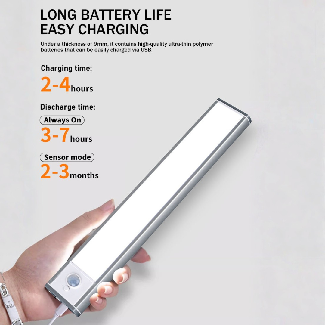 Brighten any space with this ultra-slim, USB-C rechargeable Magnetic Motion Sensor Light—perfect for kitchens, wardrobes, hallways, stairs and bedside use. Designed for effortless installation, it attaches instantly with the included magnetic 3M strip, making it completely wireless and renter-friendly.